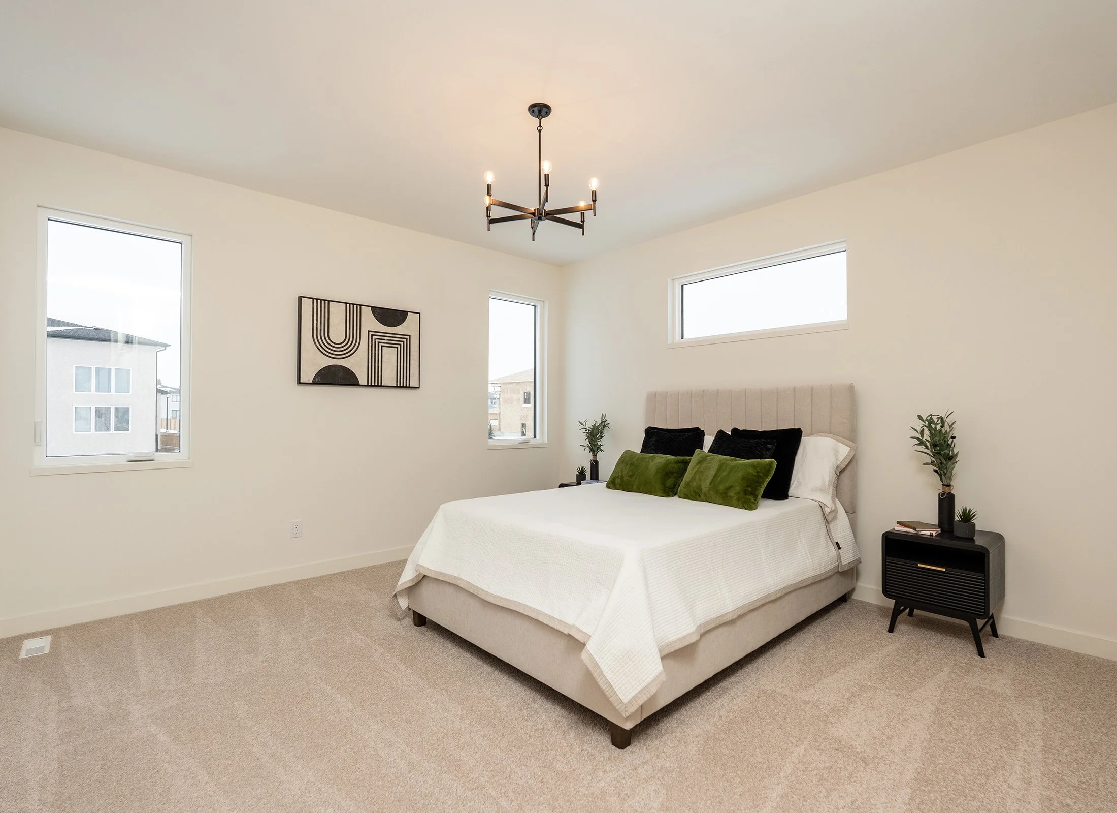 The dining room is located nicely convenient to the kitchen, denoted by a modern take on a candelabra. Renowned Winnipeg-based Windeck supplied the PVC decking material incorporated into the outdoor deck. The deck can be accessed via patio doors from the dining room.