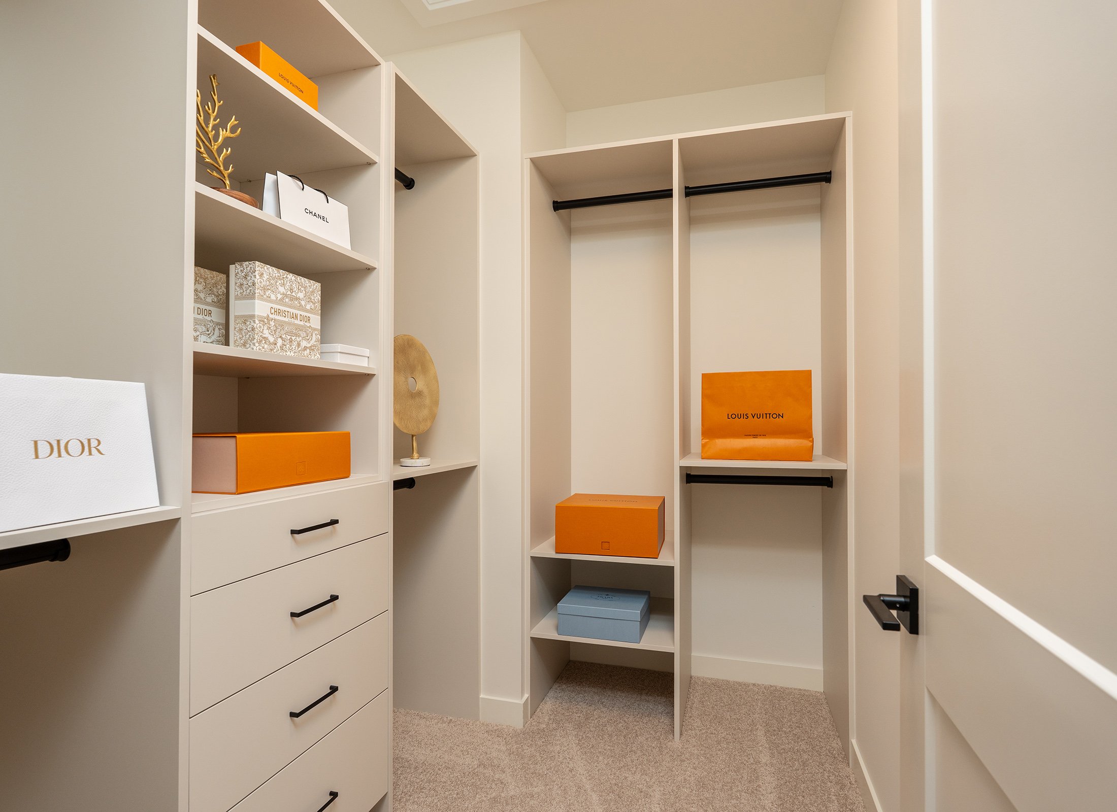 AyA Kitchens created this custom closet system as part of the primary bedroom. It is accessed via an eight-foot-tall interior door from Springhill Lumber, which also supplied much of the building materials for this home.