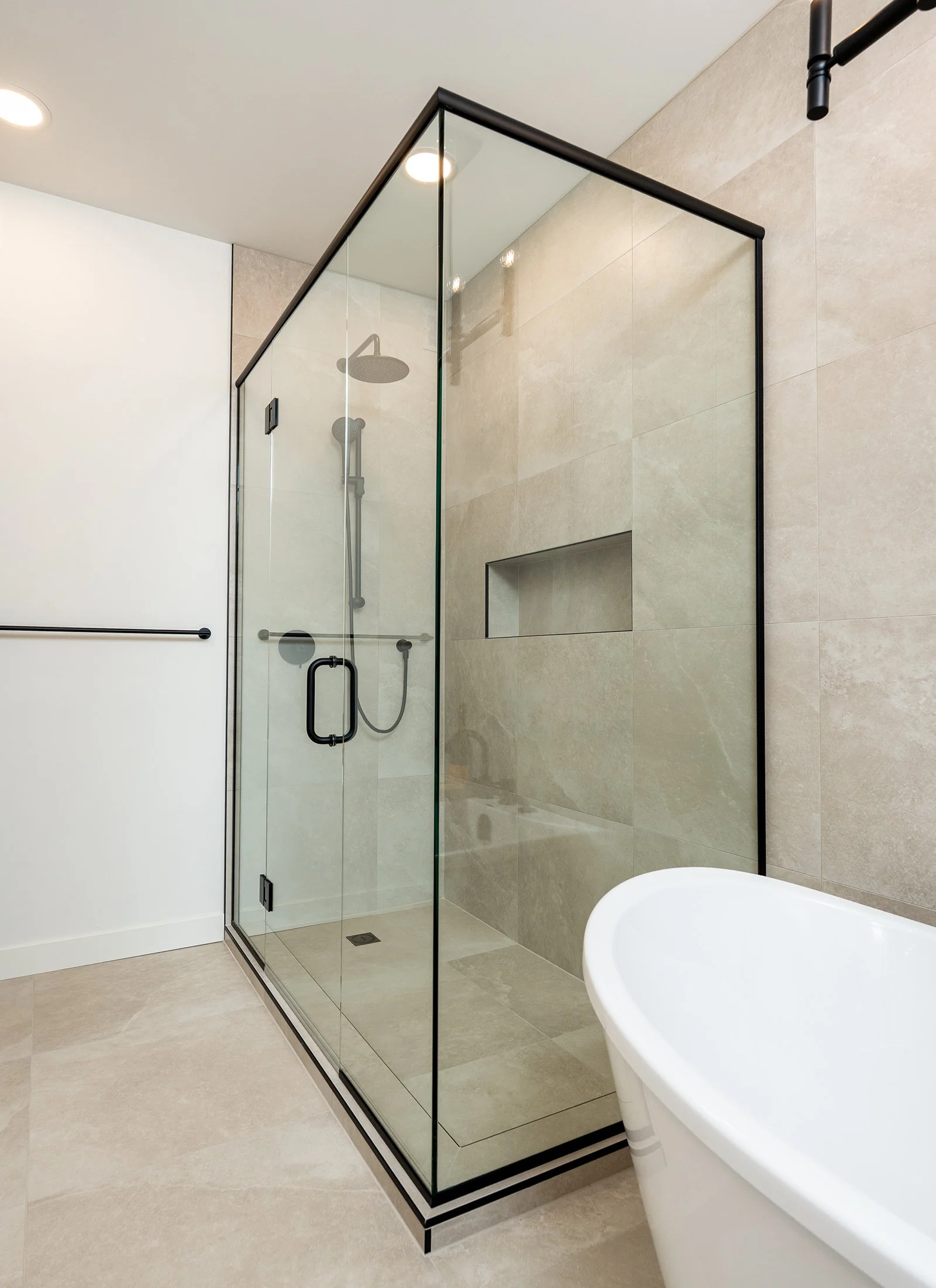 The floor tile pattern extends up onto the shower wall for a seamless, high-end look in the ensuite.