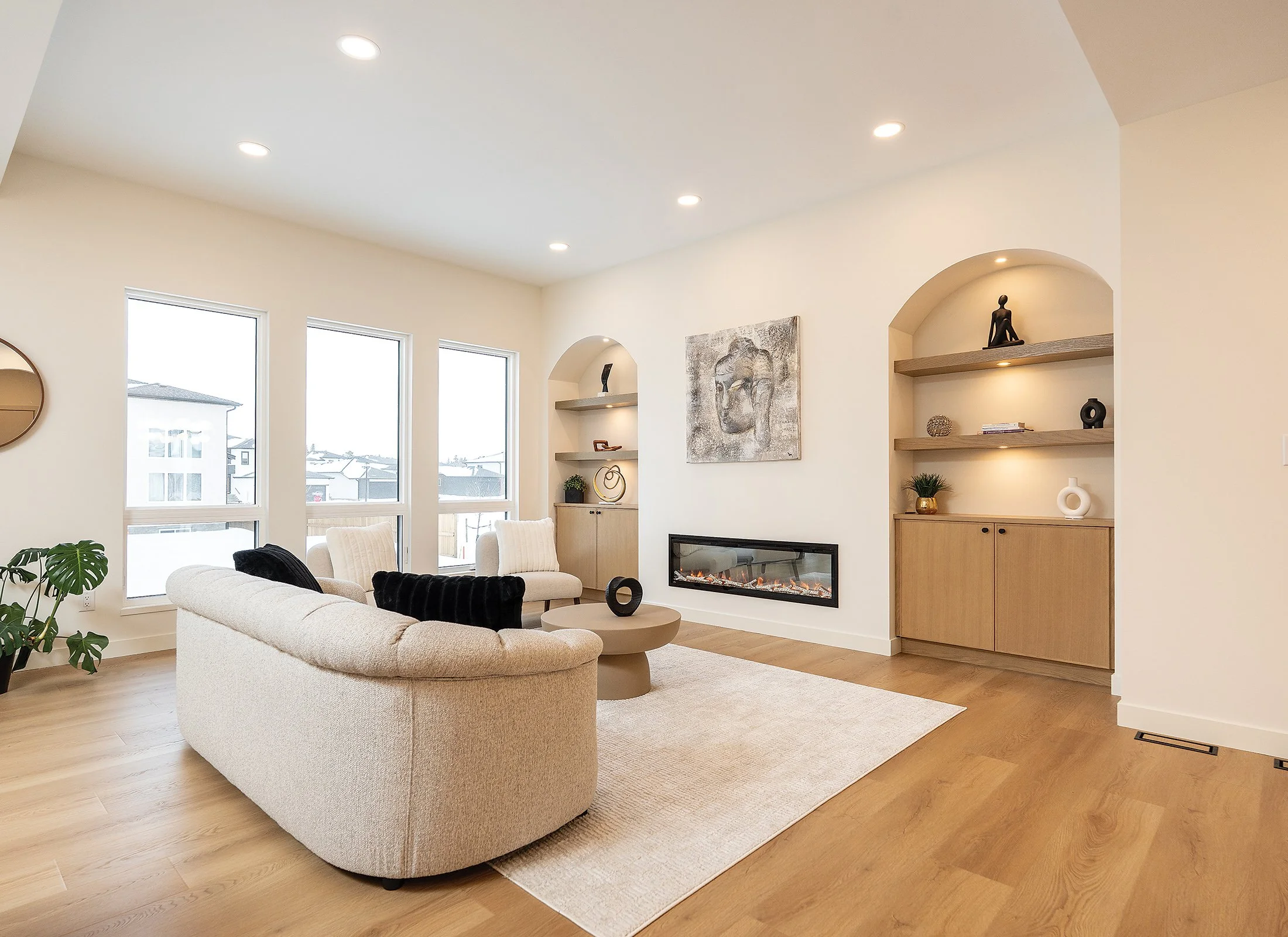 Incorporating the “wow factor” in the great room, a 10-foot-high ceiling, linear electric fireplace, two custom entertainment units with cabinets and shelves and a trio of large, triple-pane windows contribute to a cohesive, visually stunning space.