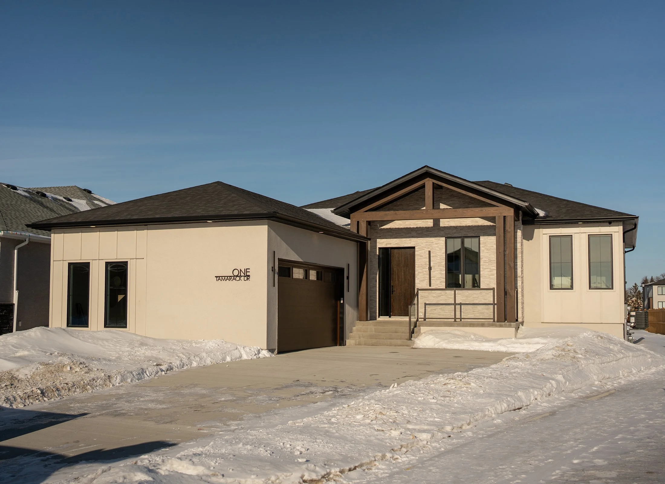On the home’s façade, acrylic stucco, standard on every Summerview Home, is paired with LP® SmartSide® Board and Batten—an engineered wood siding solution. This combination ensures a low-maintenance exterior equipped to endure Manitoba’s tough climate.