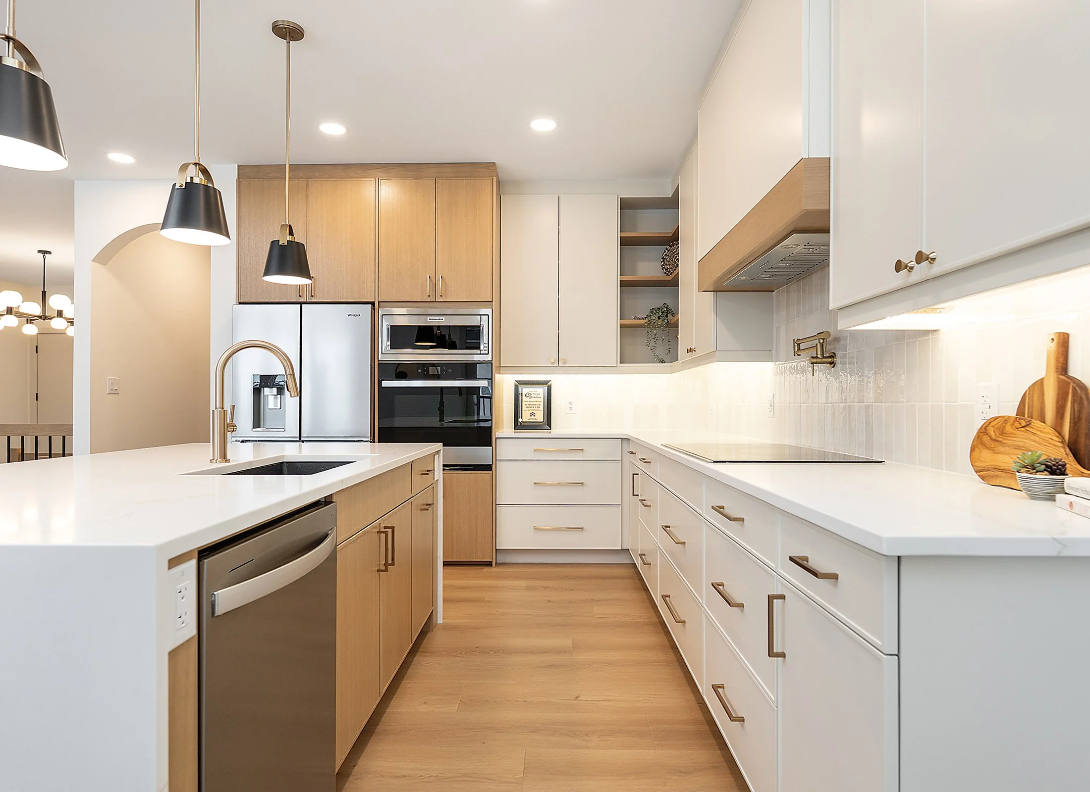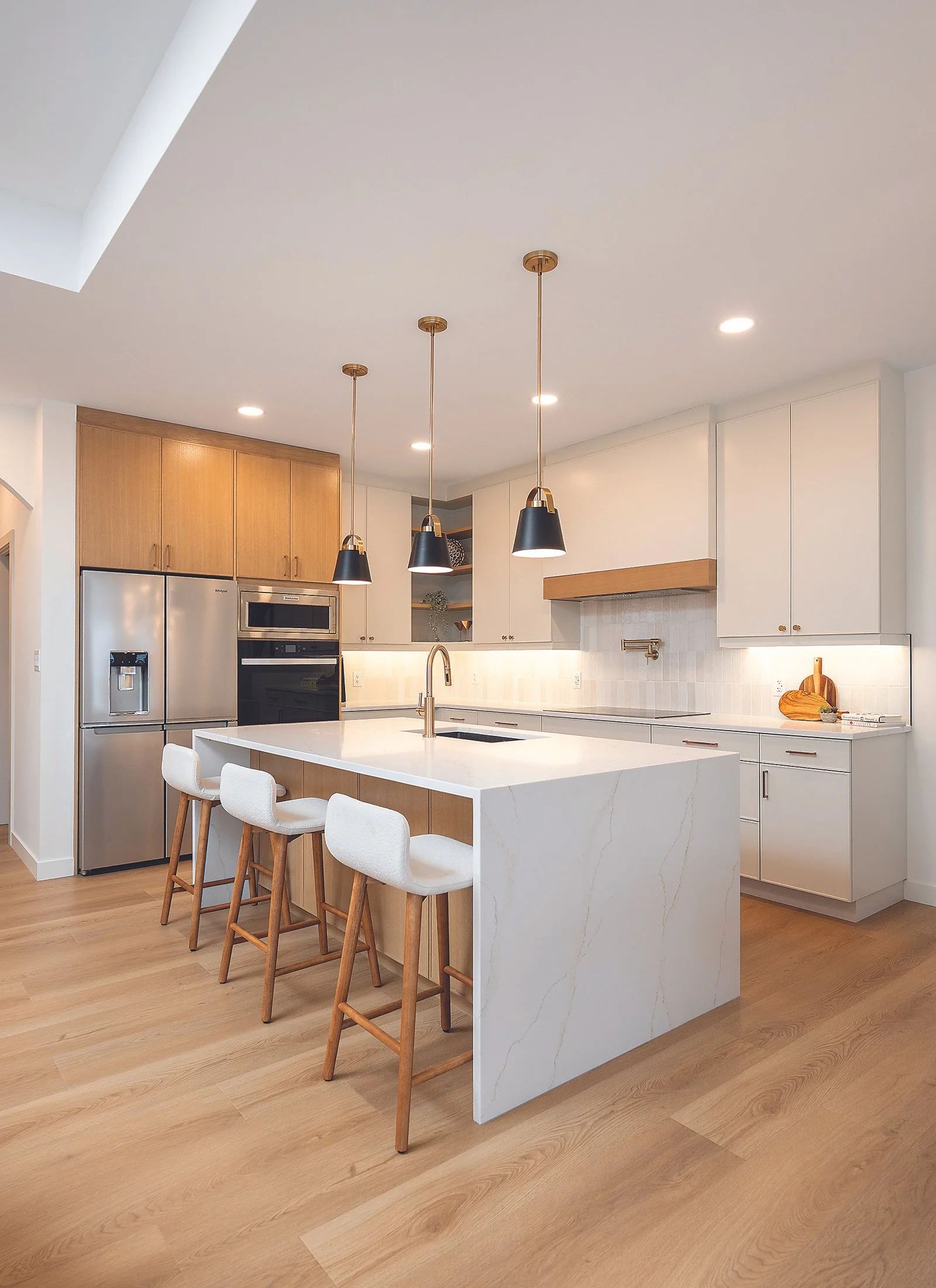 Adjacent to the great room is the gorgeous kitchen, outfitted with stainless-steel integrated appliances and a large island with waterfall quartz countertops by Take Us For Granite. The island is a multi-functional hub, housing prep space, sink, a dishwasher and hidden storage along the seating area. A set of black and gold light fixtures suspended above the island create an elegant visual divide between kitchen and great room spaces.