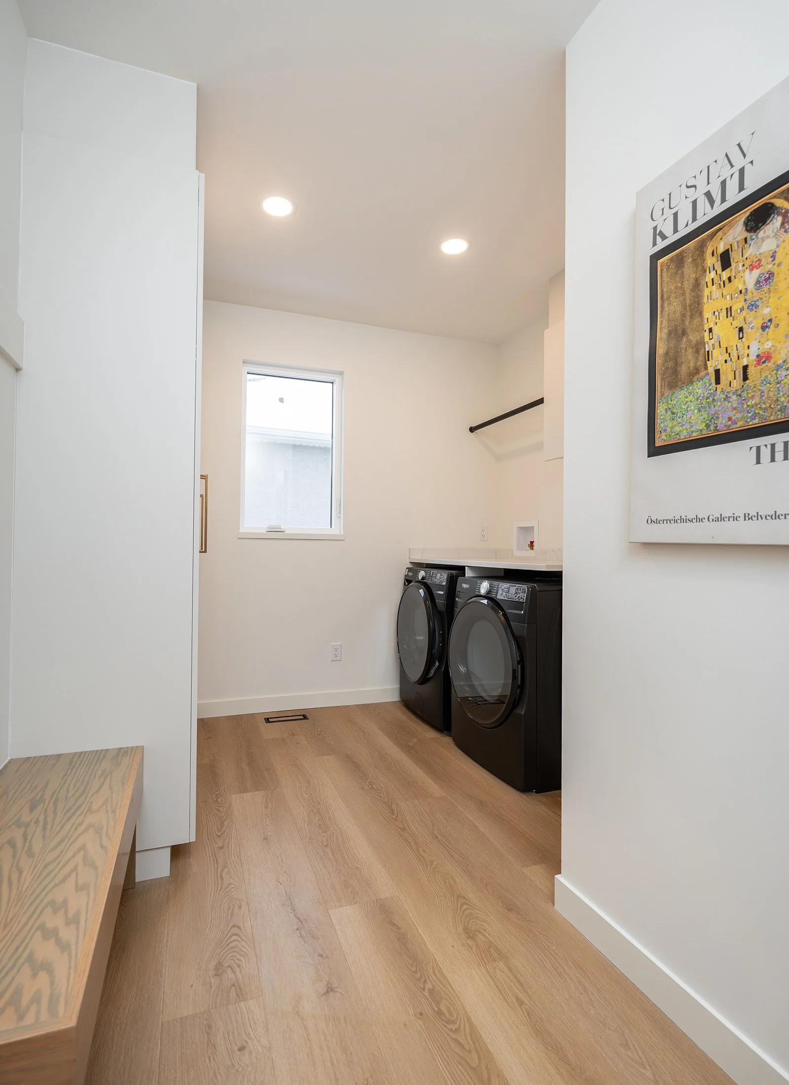 A mudroom/laundry room combination accessed from the garage features a custom closet system by AyA Kitchens and an integrated bench to make it a convenient staging and storage area on entering and leaving the home.