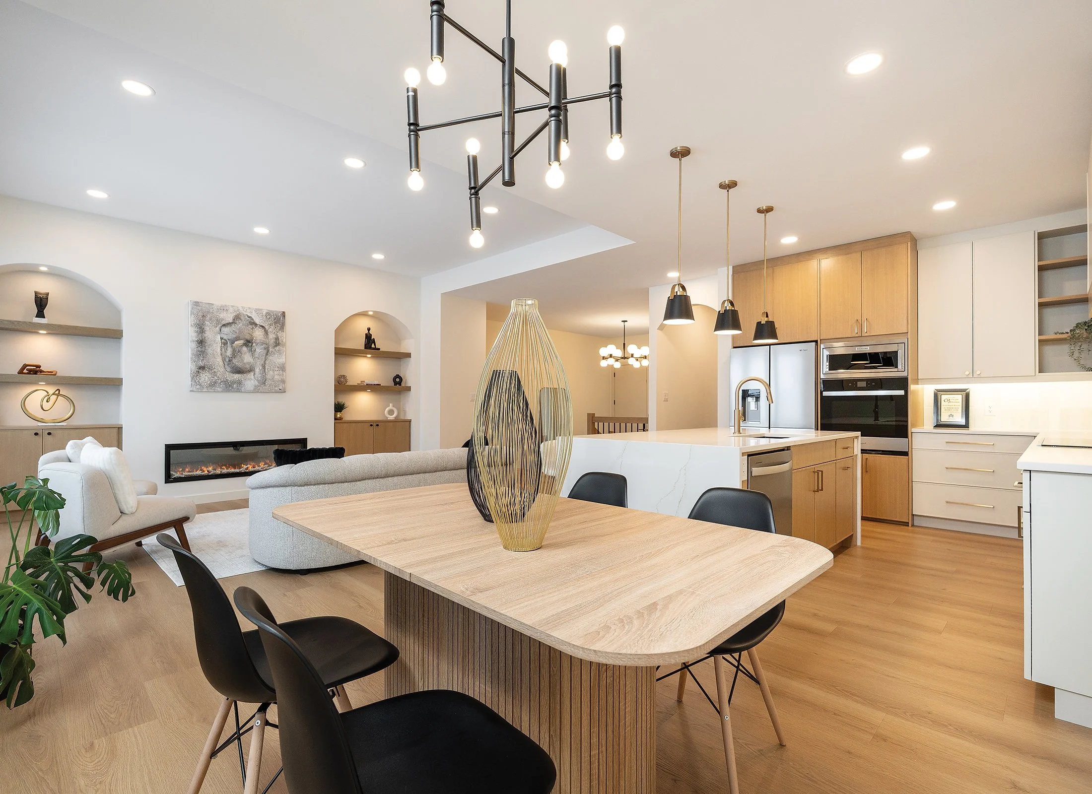 The dining room is located nicely convenient to the kitchen, denoted by a modern take on a candelabra. Note the durable, water-resistant luxury laminate flooring from Ultimate Flooring used throughout the main floor living area.