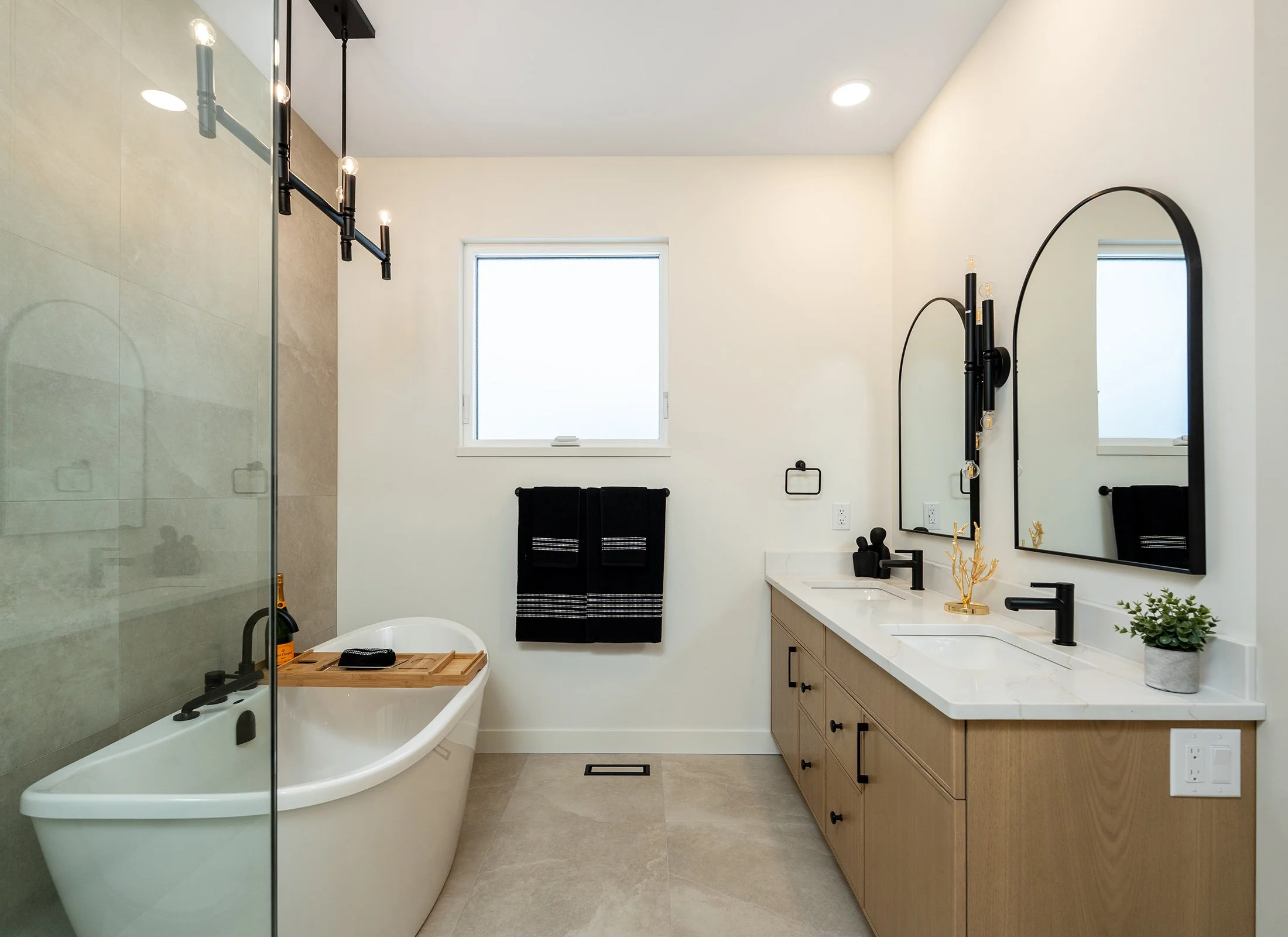 Replete with a soaker tub, double vanity, oversized walk-in shower with glass surround, heated porcelain 24”x 24” square porcelain tile flooring and black matte fixtures, the ensuite represents the ultimate in relaxation. The floor tile pattern extends up onto the shower wall for a seamless, high-end look.