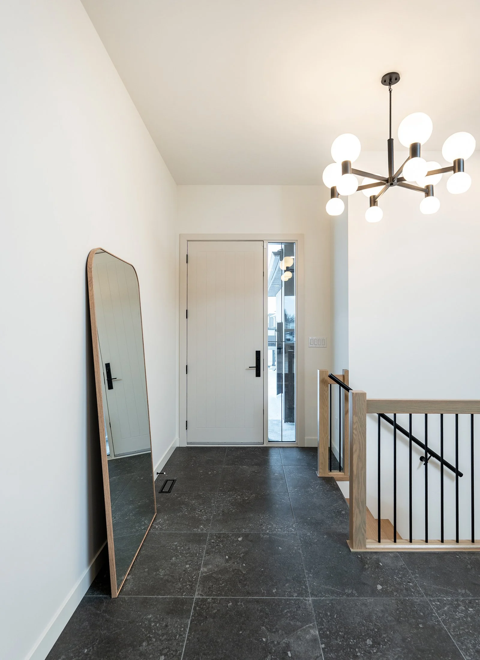 At the front entrance is a spacious foyer with large black ceramic tiles and striking light fixture that make for a dramatic statement. The black spindles on the stairwell leading to the lower level tie into the black accents throughout.